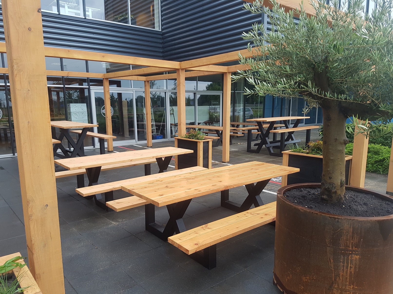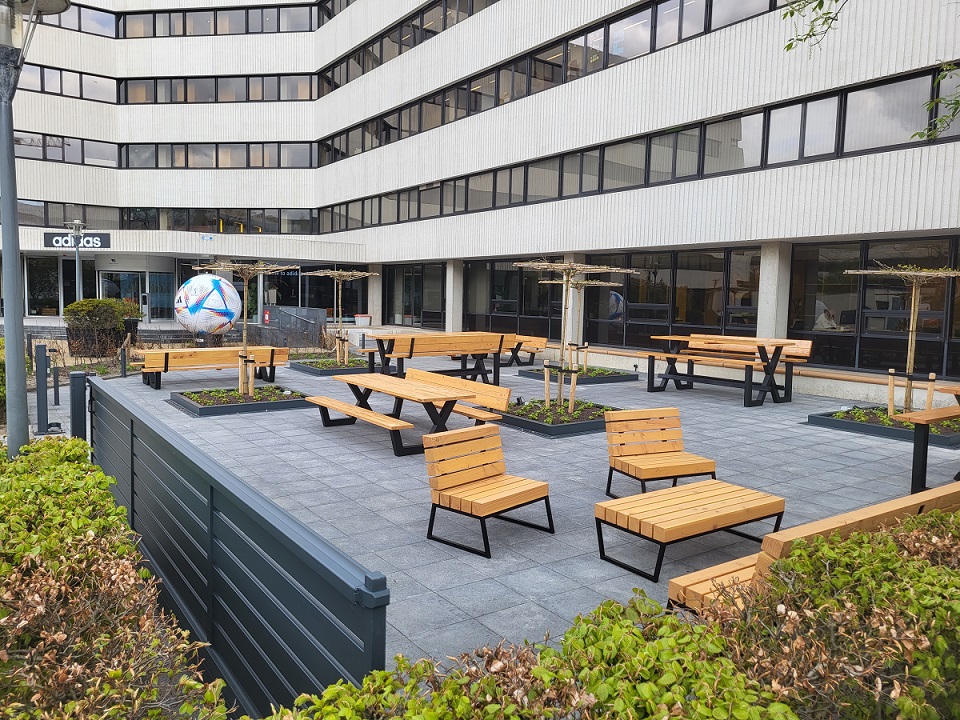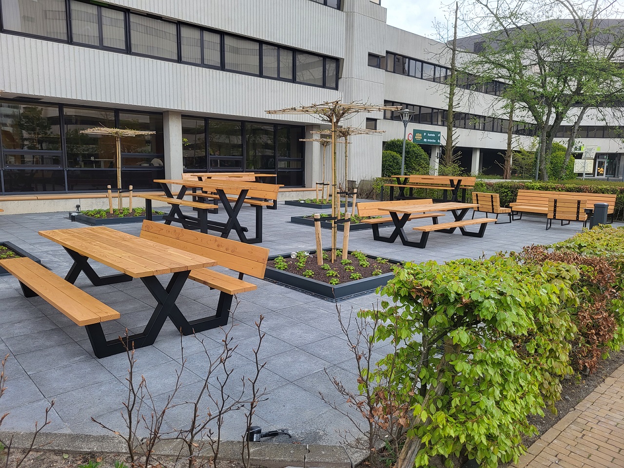 Van leeg buitenterras naar een fijne plek om bijvoorbeeld in je pauze even te kunnen lunchen. Hier zijn naast picknicktafels in verschillende hoogtes ook loungebanken zonder rugleuning geplaatst. Voor de extra sfeer met vaste en losse plantenbakken.