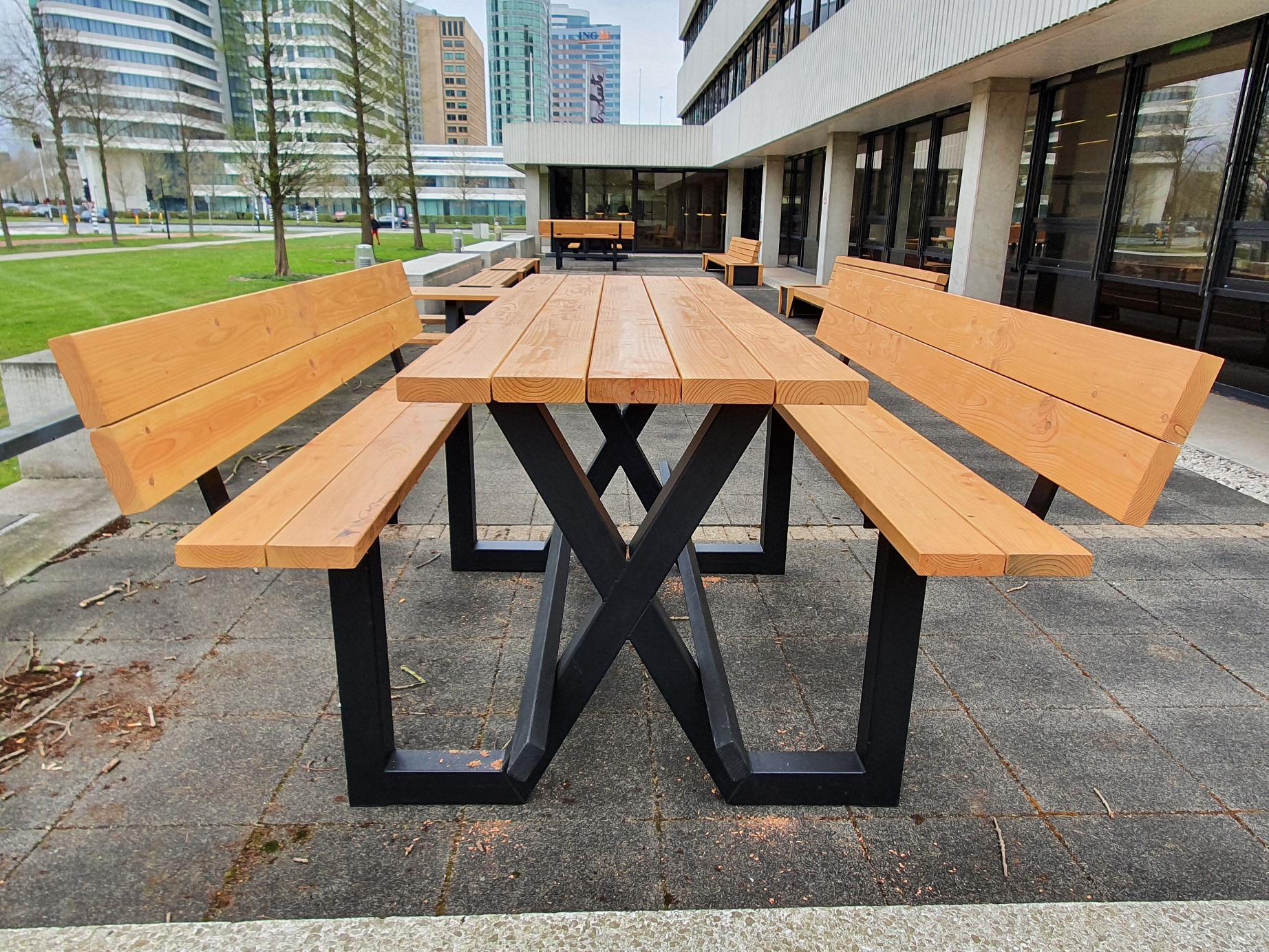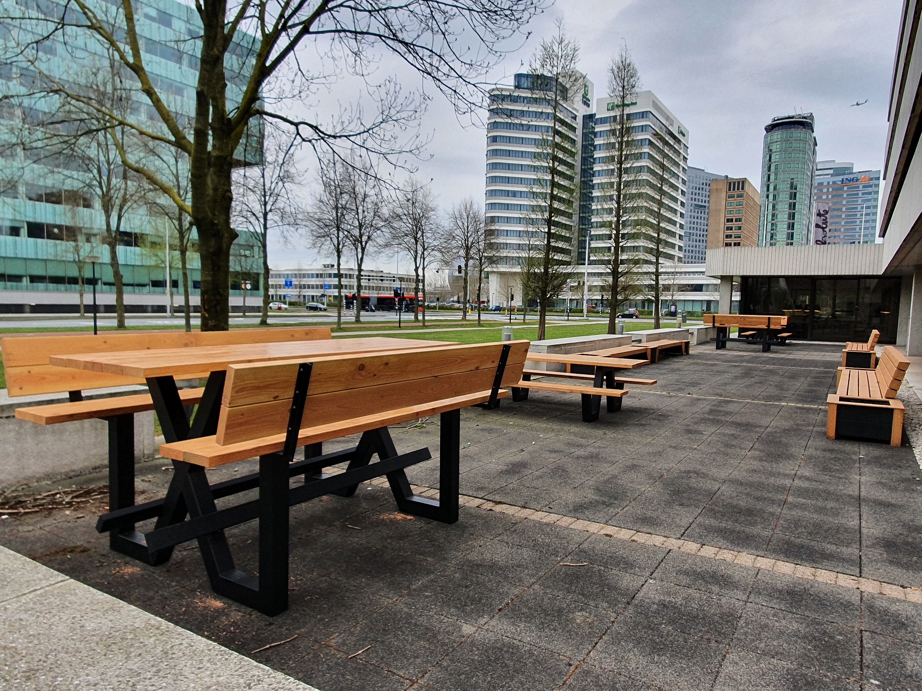 Nadat het buitenterras van het hoofdkantoor in Amsterdam opnieuw was aangelegd mochten wij het afmaken met verschillende buitenmeubels. Meerdere hoge en lage industriële picknicktafels hebben we geplaatst en een heerlijke lounge set erbij. Door het hogere model een perfecte hoogte om er ook zonder kussens goed op te kunnen zitten.