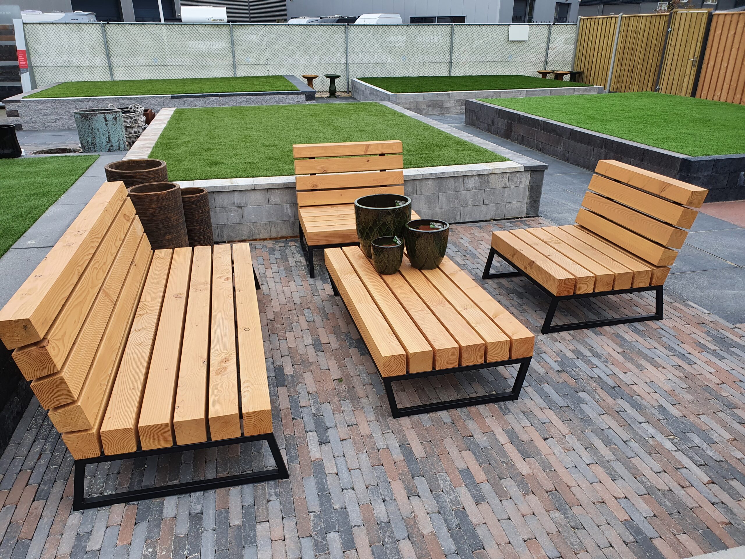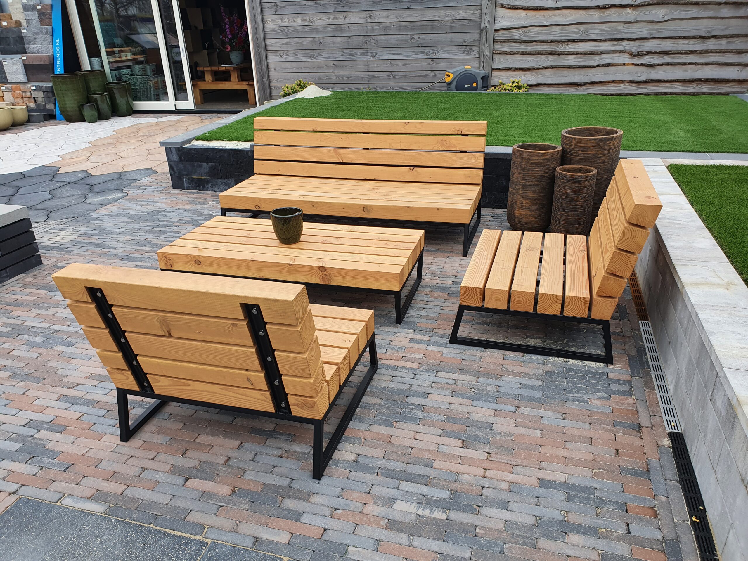 Deze complete loungeset combineert vakmanschap met stijl en is volledig handgemaakt. Of je nu wilt ontspannen in je eentje met een goed boek of een gezellige buitenborrel wilt organiseren, deze loungeset is je ideale metgezel. De losse elementen zijn gemaakt van dik duurzaam douglas hout en een stalen onderstel, waarmee de loungeset bestand is tegen de elementen en zal hij jarenlang meegaan, ongeacht het weer.