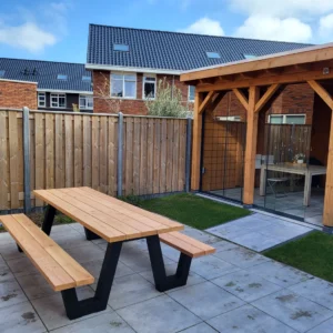 Maar het is niet alleen de kwaliteit van het hout dat deze picknicktafel zo bijzonder maakt. Het industriële ontwerp, met stalen frame geeft de tafel een unieke uitstraling die zowel modern als robuust is. Het is een perfecte combinatie van stijl en functionaliteit.