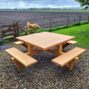bekend om zijn robuuste kwaliteit en natuurlijke uitstraling, is deze picknicktafel ontworpen om lang mee te gaan en bestand te zijn tegen de elementen.