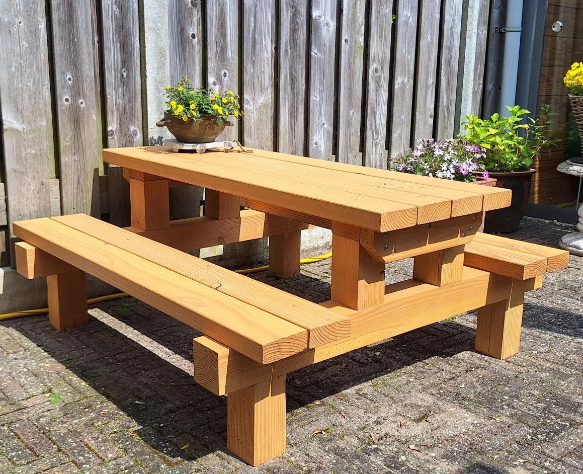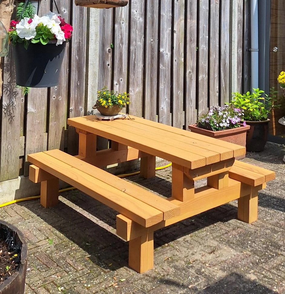 De natuurlijke houtnerf geeft deze picknicktafel een onderscheidend karakter en voegt een warme uitstraling toe aan elke buitenruimte.