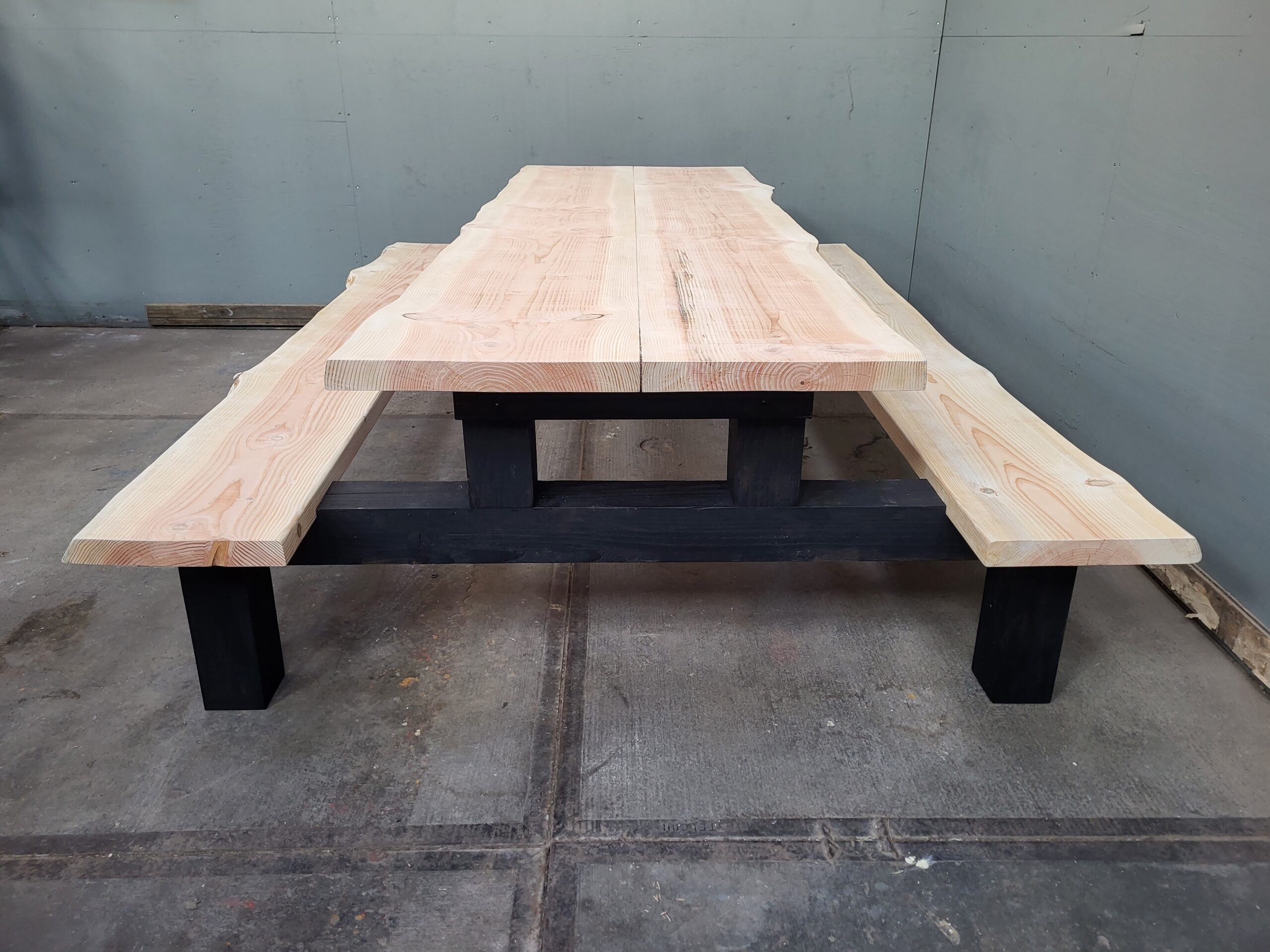 Deze prachtige picknicktafel van massief douglas hout is gemaakt uit complete boomstammen. Bij deze picknicktafel is het onderstel zwart geverfd. Met een formaat van 2,00 x 1,80 meter biedt hij voldoende ruimte voor een grote groep vrienden en familieleden, waardoor het perfect is voor bijeenkomsten in de buitenlucht. Daarbij is deze picknicktafel ook beschikbaar in de maten 2,50 x 1,80 meter en 3,00 x 1,80 meter, zodat nog meer mensen kunnen genieten van deze tafel.