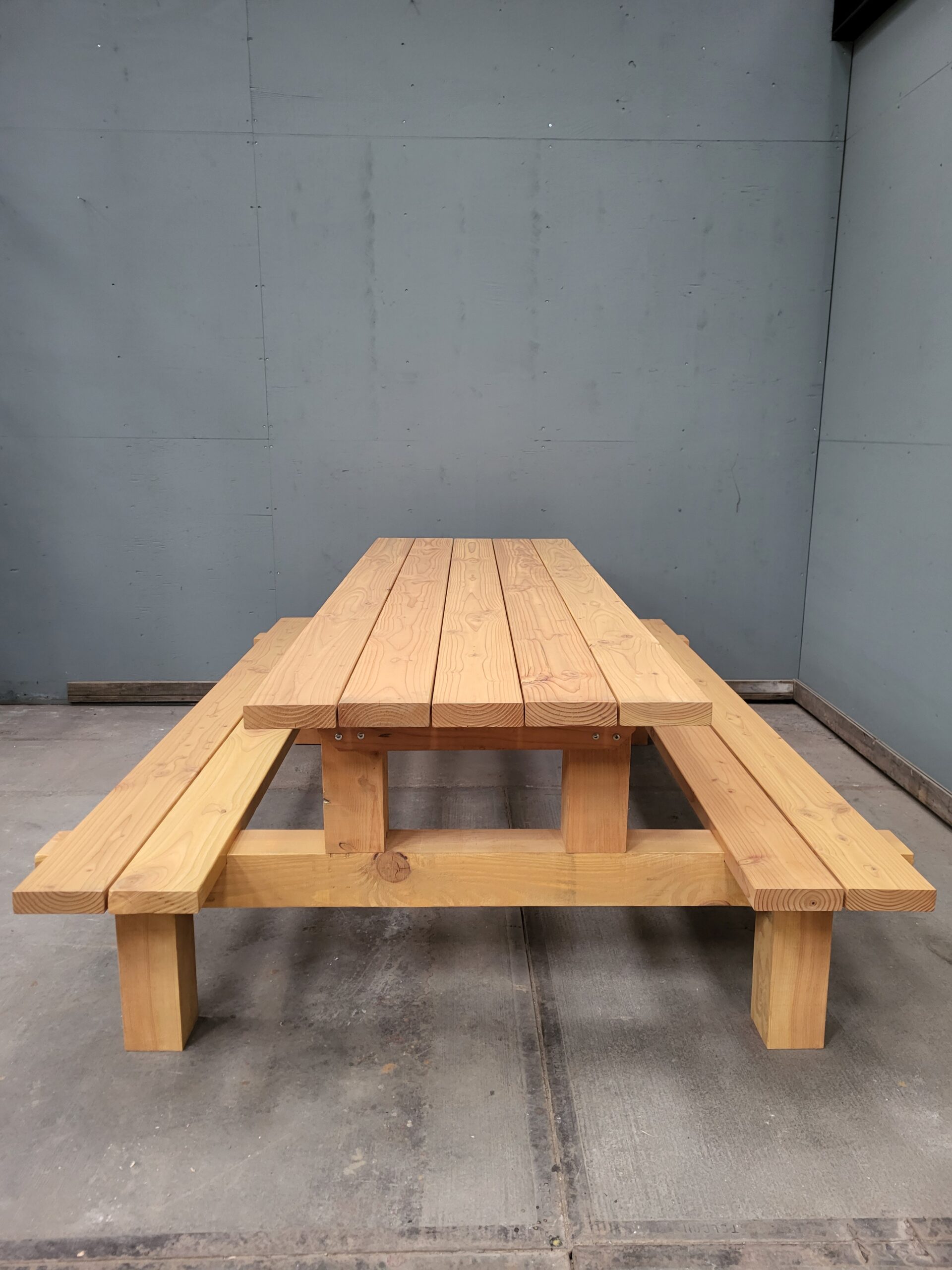 Deze prachtige picknicktafel van massief douglas hout is niet zomaar een meubelstuk, maar een outdoor ervaring. Met een formaat van 2,50 x 1,80 meter biedt het voldoende ruimte voor een grote groep vrienden en familieleden, waardoor het perfect is voor bijeenkomsten in de buitenlucht.